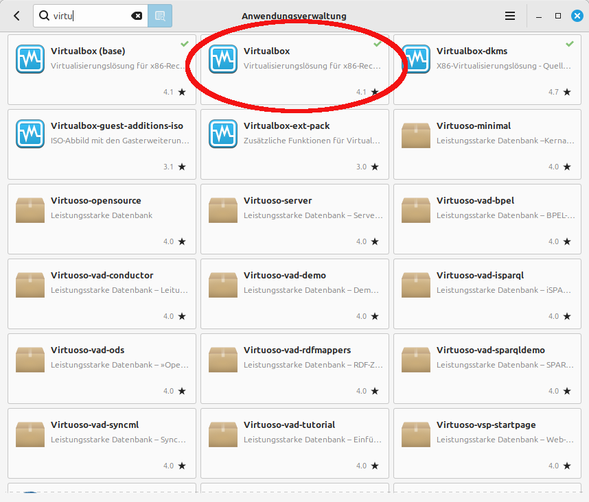 Zunächst mal habe ich VirtualBox installiert. Dies geschieht über die Anwendungsverwaltung.